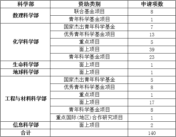 目前,国家自然科学基金的申报工作已经结束,我院共申报基金140项。申报项目中包括:国家杰出青年科学基金12项、优秀青年科学基金项目21项、重点项目6项、面上项目60项、青年科学基金项目32项、联合基金项目8项、重点国际(地区)合作研究项目1项。预祝各位老师成功获批!