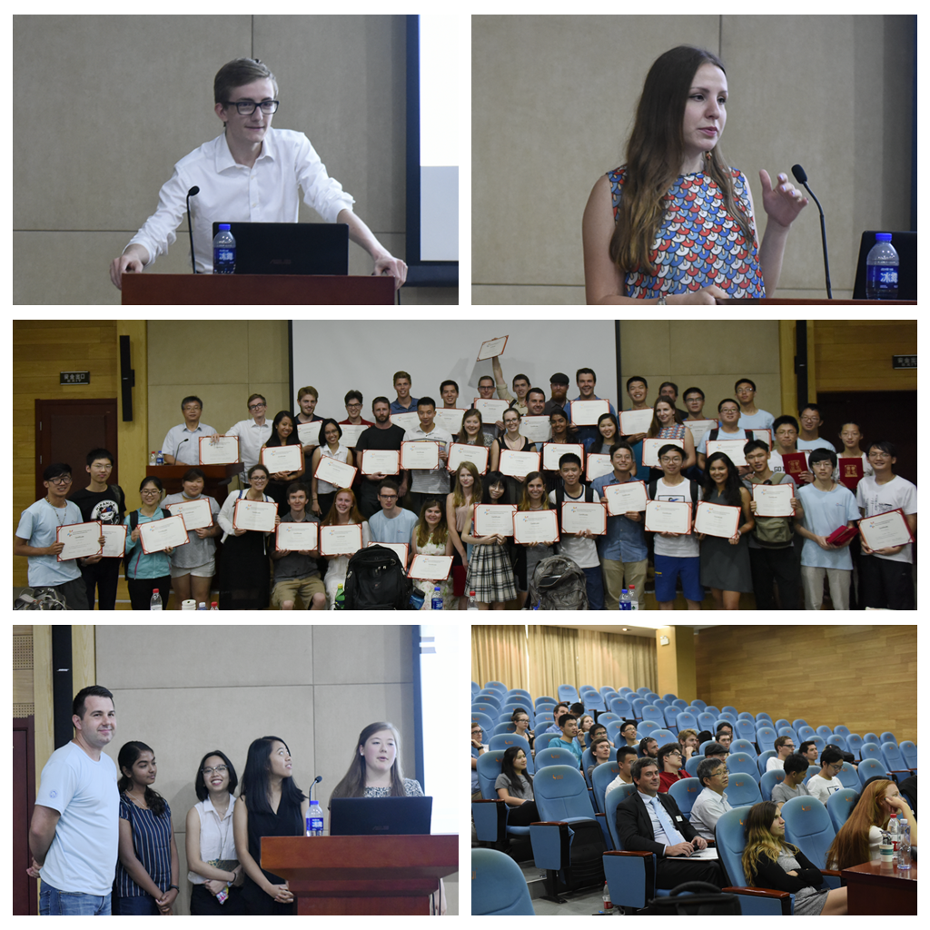 闭营式上,来自剑桥大学、约翰霍普金斯大学、伊利诺伊大学香槟分校、北卡大学教堂山分校等17所国外知名高校的优秀营员,对自己在科大为期两周夏令营期间学习研究经历和心得体会进行交流展示。报告过程中,营员们通过文字、图片、音频、视频等方式生动地展示了各自的科研实践和夏令营活动,精彩纷呈,目不暇接。大家饱含着对未来化学/生命学家国际夏令营的热爱以及不舍,引起了台下营员们的阵阵共鸣,掌声如潮。四个小时的报告结束后,Drew Parsons博士与李群祥教授分别为本次夏令营中表现出色的营员和志愿者们颁发荣誉证书,期待着下次相遇!