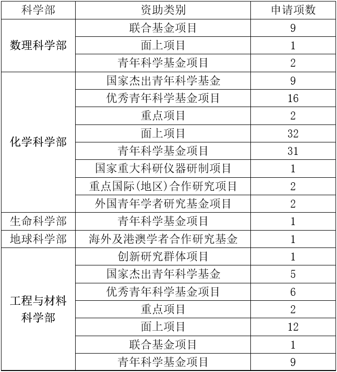 目前,国家自然科学基金的申报工作已经结束,我院共申报基金145项。申报项目中包括:创新研究群体项目1项、国家杰出青年科学基金14项、优秀青年科学基金项目22项、重点项目4项、面上项目45项、青年科学基金项目43项、联合基金项目10项、国家重大科研仪器研制项目1项、重点国际(地区)合作研究项目2项、海外与港澳学者合作研究基金项目1项、外国青年学者研究基金项目2项。预祝各位老师成功获批!