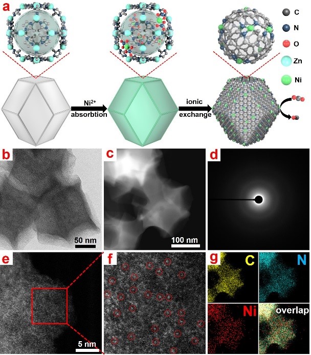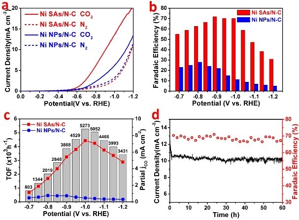 吴宇恩教授课题组针对该系列挑战,以ZIF-8作为前驱体,通过双溶剂法吸附镍盐并利用高温下离子交换成功得到了氮配位的镍单原子位点。镍单原子通过配位键被很好的锚定在含氮基底上,这种特殊的结构使得催化剂具有很好的二氧化碳电催化活性和非常好的稳定性。在-1.0V电位下,电流达到10.48mA/cm2,一氧化碳的生成选择性达到71.9%,在该电位下一氧化碳转化频率(Turnover Frequency,TOF)达到5273h-1,并且实现了超过60个小时的约10mA/cm2的稳定电流密度。