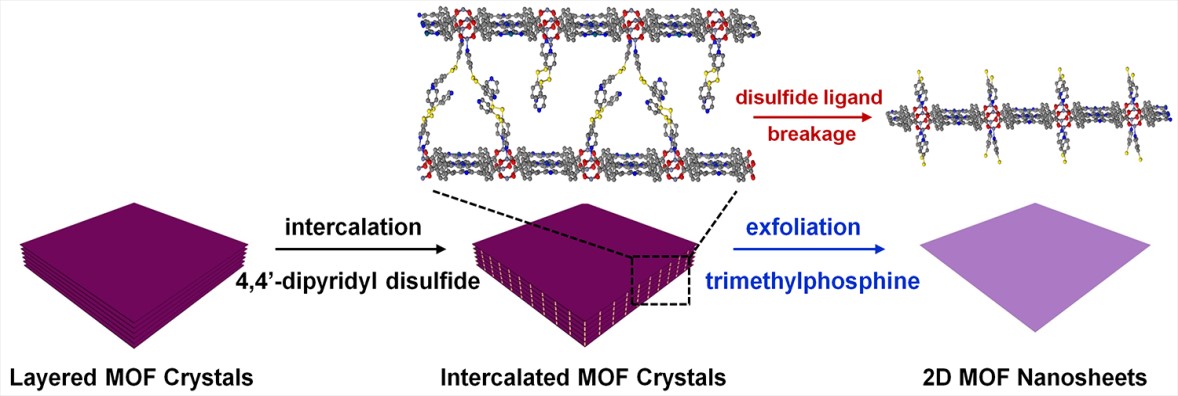 近日,由中国科学技术大学化学与材料科学学院的徐航勋教授带领团队与本院的江海龙教授以及Texas A&M University的Hong-Cai Zhou教授合作,在超薄金属有机框架(MOFs)纳米片的高效插层剥离制备方面取得重要进展。该成果以“Controlled Intercalation and Chemical Exfoliation of Layered Metal-Organic Frameworks using A Chemically Labile Intercalating Agent”为题发表在《美国化学会志》杂志上((J. Am. Chem. Soc. 2017, DOI: 10.1021/jacs.7b04829))。该论文第一作者为中国科学技术大学化学与材料科学学院博士生丁言军。