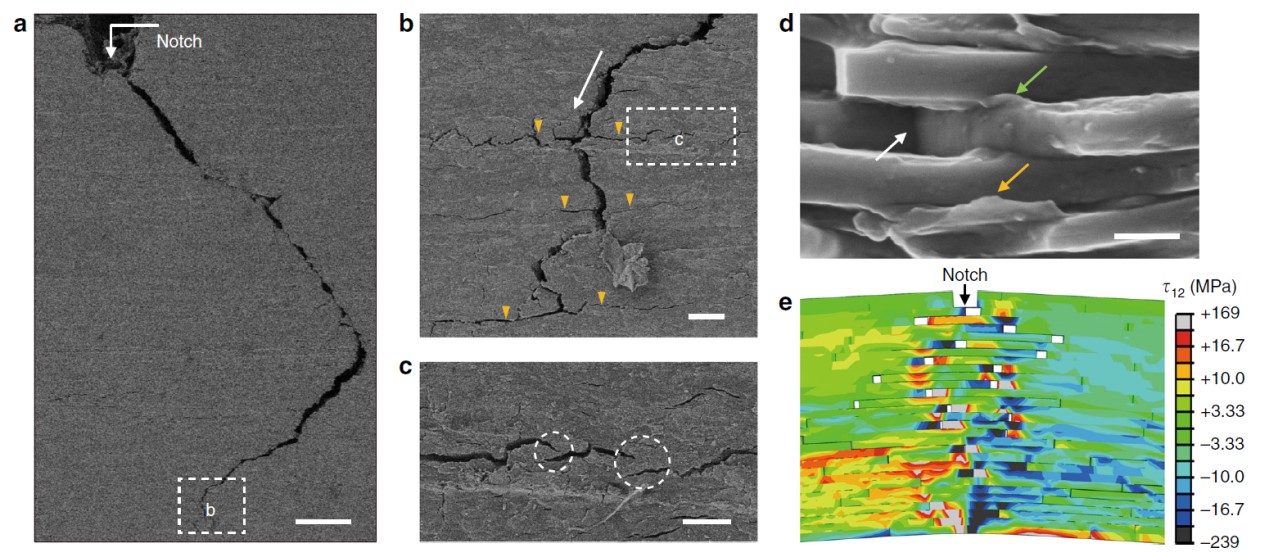 图2. (a) SEM图像显示了在开口弯曲测试中,大尺度的裂纹偏转;(b) SEM图像显示了裂纹偏转、分叉、以及萌生的多级裂纹;(c) SEM图像显示了接近裂纹末端的裂纹桥;(d) SEM图像显示了磷酸钙微纳片的拔出,海藻酸钠聚合物的桥连、牵引;(e) 非线性有限元模拟人工珍珠层材料的破坏过程。