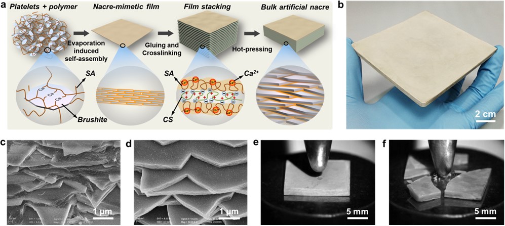 图1. 大尺寸体型人工珍珠层材料的高效仿生制备。(a) 设计思路与制备策略;(b) 人工珍珠层材料的数码照片;(c) 人工珍珠层材料; (d) 天然珍珠层材料的SEM显微结构;(e) 高速相机捕获的人工珍珠层材料和(f)天然珍珠层材料的冲击测试过程。