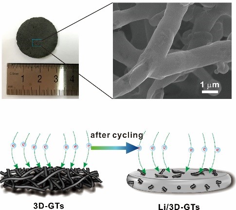 近日,我院季恒星教授课题组提出三维共价连接的sp2杂化石墨微米管作为金属锂负极的集流体,以实现抑制锂枝晶的同时,限制副反应的发生,达到金属锂的高效利用。这种结构的优点在于(i)sp2杂化碳原子形成的骨架结构具有极强的导电能力;(ii)在原子尺度上共价连接的结构单元形成宏观尺寸下的三维块材,极大的消除了微纳结构单元间的界面电阻;(iii)微米级骨架结构具有优化的比表面积,同时限制锂枝晶和SEI的形成。三维共价连接的sp2杂化石墨微米管的金属锂负极可以在循环面容量10 mA h cm-2,金属锂利用率91%的条件下,循环3000小时而没有发生短路。即使在电流密度10 mA cm-2下,金属锂负极仍可实现10 mA h cm-2的面容量。这种三维共价连接的sp2杂化石墨微米管集流体的设计思路对其他类型的金属电池同样具有借鉴意义。相关研究成果以“High Areal Capacity and Lithium Utilization in Anode Made of Covalently-Connected Graphite-Microtubes”为题发表在《先进材料》杂志(Advanced Materials, 2017, Doi:10.1002/adma.201700783)。论文的第一作者是中国科学技术大学化学与材料科学学院博士研究生金松。
