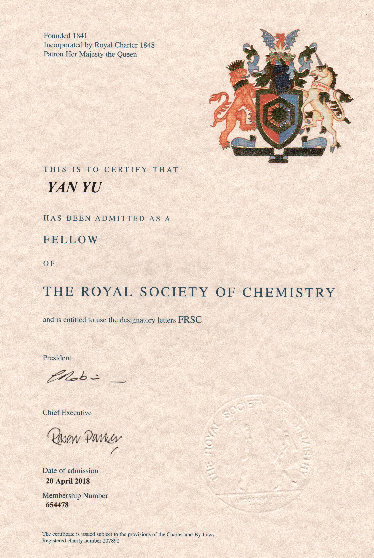 日前,我院材料系余彦教授收到英国皇家化学会颁发的证书,当选为英国皇家化学会会士(Fellow of the Royal Society of Chemistry,FRSC)。