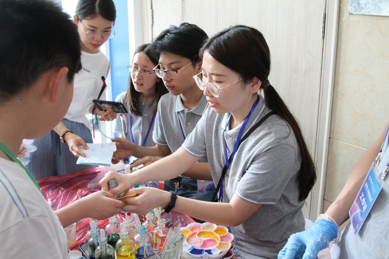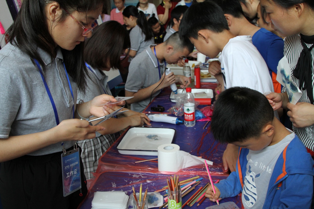 2019年是元素周期表诞生150周年,被联合国大会宣布为“国际化学元素周期表年”。环资楼门前设立的元素周期表巨幅展板引起了参加活动公众的广泛关注。环资楼一楼大厅开设了二十余个趣味化学实验:热缩片、动力液滴、分子模型搭建、海藻酸钙微胶囊的制备、牛奶豆浆、琼脂果冻、水果电池、叶脉书签的制作等活动,深受广大群众与小朋友们的欢迎。早上不到开放时间,大厅里就涌入大量热情期待的参与者。在志愿者的讲解和指导下,前来参观的小朋友们纷纷动手体验,不仅感受了化学实验的乐趣,还凭借参与活动积攒的印章兑换到精美的学校纪念品。