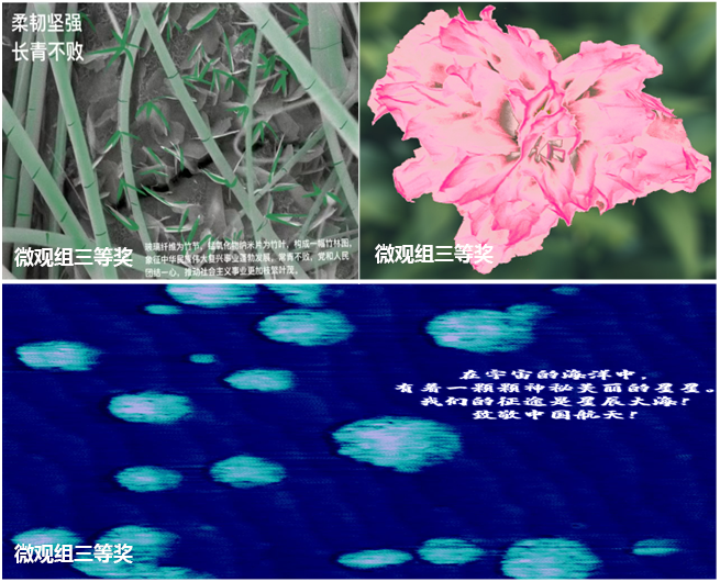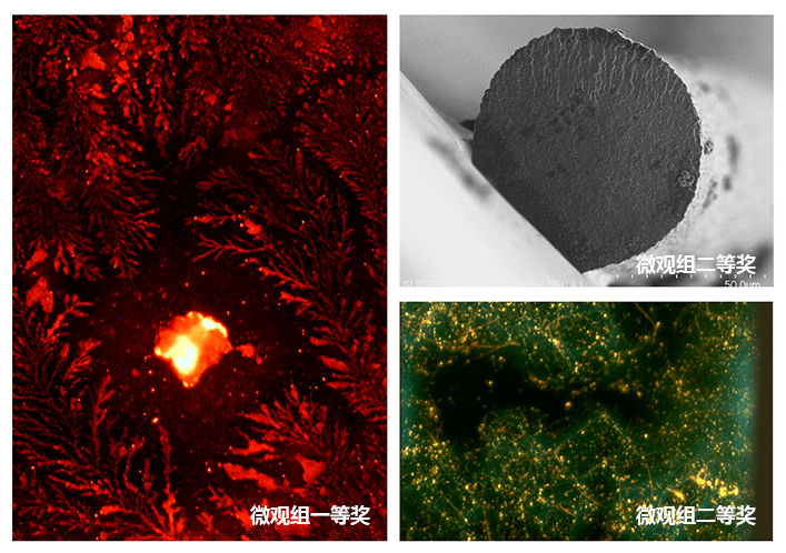 微观组总票数计145票。其中,袁晨瑞同学的作品《星星之火》荣获一等奖,其将结晶样品描绘成松针的纹路,中心处样品发出强烈的荧光则像是林中的火焰。此外,周扬同学的作品《星光灿烂》、刘蝶同学的作品《圆塑》荣获二等奖;王晶晶同学的作品《手可摘星辰》、孙志欣同学的作品《柔韧坚强,长青不败》以及张鹏同学的作品《以纳米之名,献礼党的二十大》荣获三等奖。在微观中寻找浩瀚,在黯淡里增添绚烂。同学们的作品中尽显微观世界的蔚然之景,化学的魅力“如图可见”。