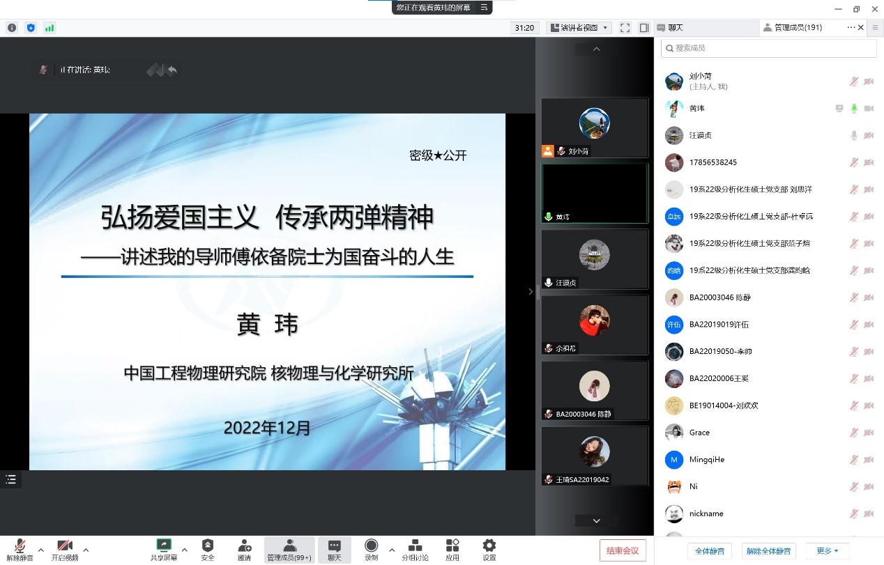 12月13日晚,化学与材料科学学院校外兼职辅导员、中国工程物理研究院核物理与化学研究所黄玮研究员为我院学生做了题为“弘扬爱国主义,传承两弹精神-讲述我的导师傅依备院士为国奋斗的人生”的主题报告。报告由学院党委副书记周小东主持,我院近200名同学聆听了此次报告。