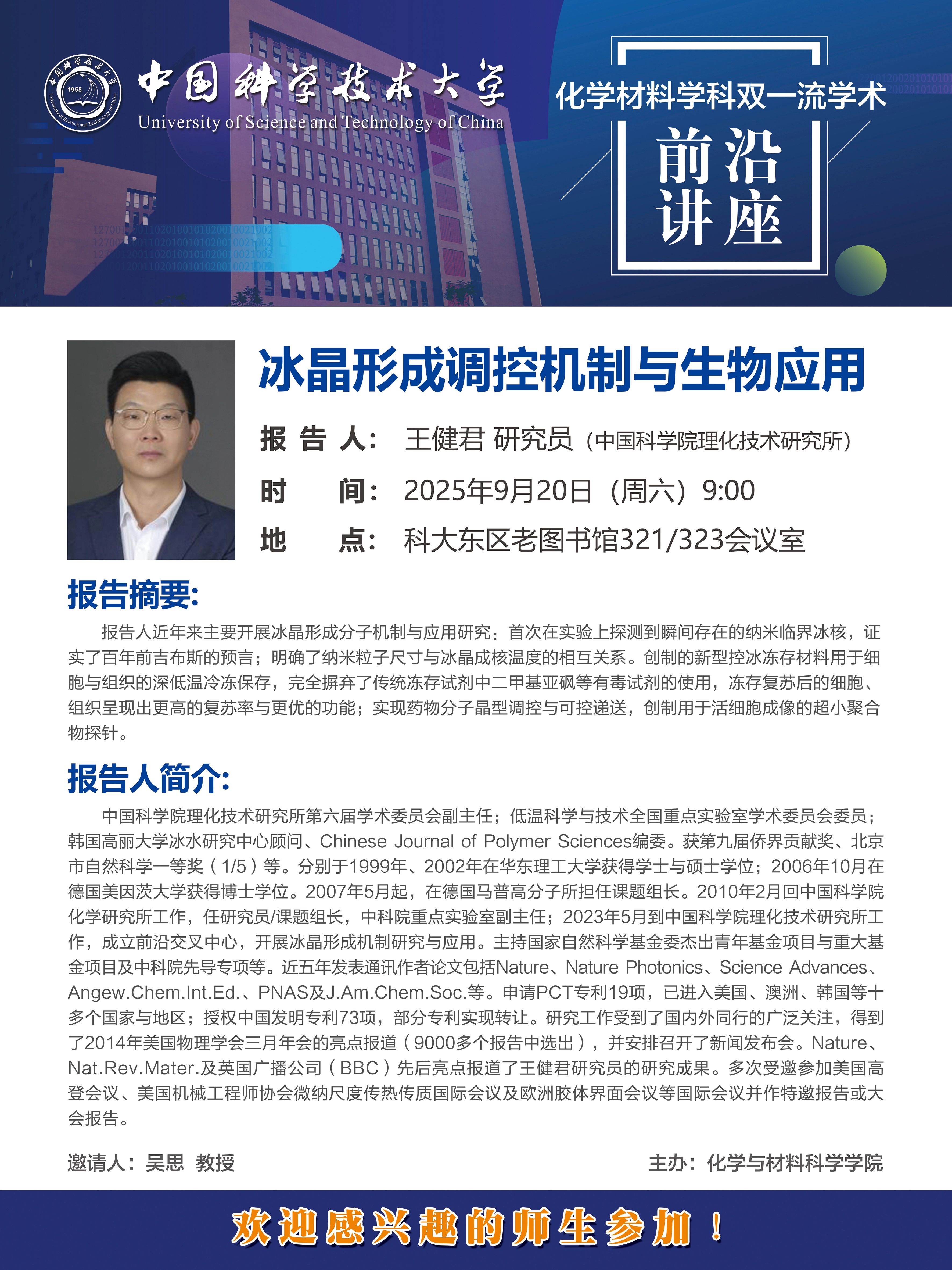 9月20日化学材料学科双一流学术前沿讲座——王健君 研究员(中国科学院理化技术研究所)