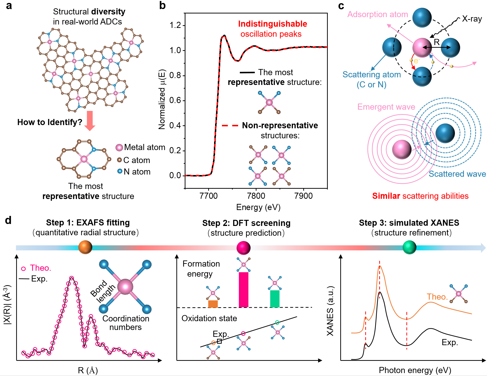 X射线吸收谱(XAS)是解析ADCs结构的核心工具,能够提供中心金属原子的平均配位数和价态信息。但由于C、N等轻元素散射能力相近,其配位结构往往难以区分,导致相似的XAS光谱可能对应完全不同的结构模型。其他表征方法如X射线发射谱(XES)、球差校正电镜(STEM)和固体核磁共振(NMR)虽各具优势,但受限于定量能力、分辨率或适用范围。相比之下,结合理论模拟的XAS依然是目前最具可操作性的定量手段,但传统的结构判定方式仍存在一定主观性和不确定性。