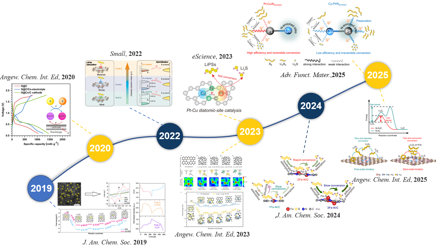 在硫基电池体系中,引入电催化剂被认为是加速硫还原反应(SRR)的有效途径。然而,硫及其反应中间体(各类硫化物)之间的电催化转化机理仍不够清晰,相关结论尚存争议。原子分散催化剂(ADCs)因金属原子利用率接近100%且具备优异催化活性而备受关注;其活性位点通常集中于中心金属原子及其配位原子,结构清楚,因而更有利于开展精确的构效关系研究。基于这一优势,中国科学技术大学季恒星教授团队长期聚焦金属活性位点的构筑与配位环境优化,提出了高效硫正极催化剂的设计新思路,并在催化位点结构演变、反应机理解析与催化材料理性设计等方面取得一系列进展。