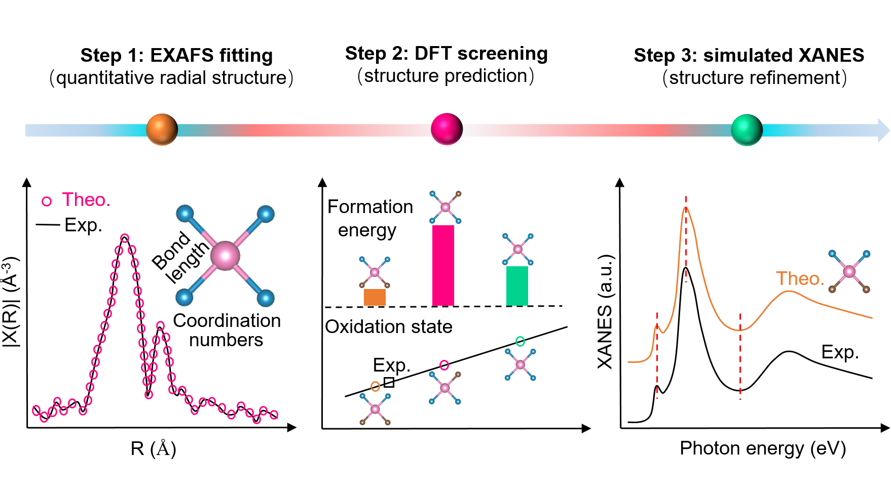 季恒星教授团队的研究结合了EXAFS与XANES分析,以获取金属中心的配位环境与氧化态信息,并通过DFT计算评估候选结构的热力学稳定性和电子特性。通过将计算与实验XANES谱进行比对,可识别最符合实际的代表性结构,并综合考虑平均配位数、氧化态及配位轻元素的类型,从而显著提升XAS结构解析的可靠性。对于合成过程中可能保留配体的ADCs,研究团队提出了配体敏感流程:首先利用原位红外、DRIFTS或在线TGA-MS定量配体/金属比;随后在EXAFS拟合中保留能够降低R因子且物理合理的配体模式;再通过DFT评估其热力学可行性;最后结合XANES拟合确认吸收边位置、白线强度及近边特征的一致性。整体而言,该研究强调多方法协同在精确识别ADCs活性位点结构中的重要作用,为构效关系的揭示与催化剂理性设计提供了更为可靠的策略。