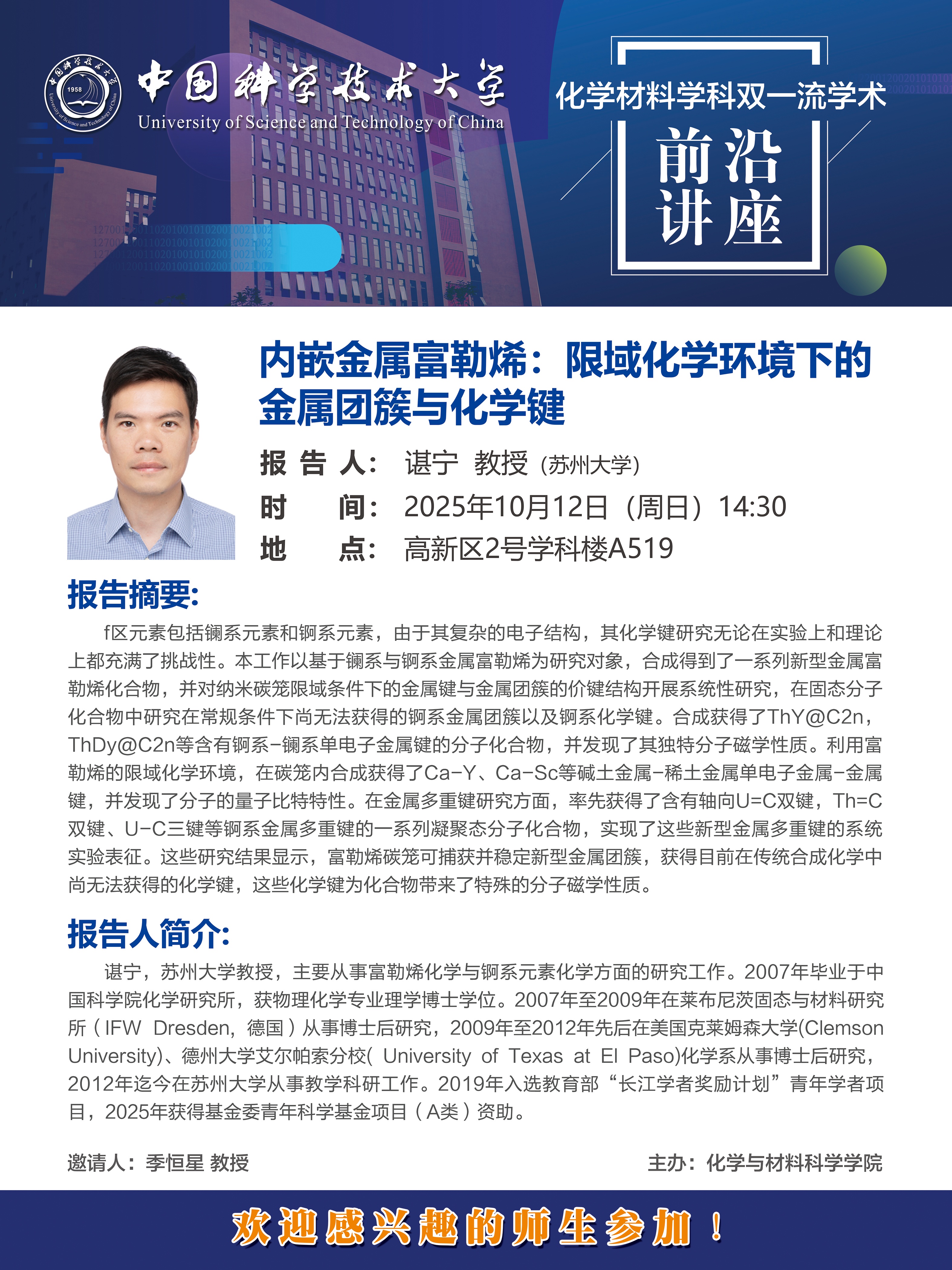 10月12日化学材料学科双一流学术前沿讲座——谌宁 教授(苏州大学)