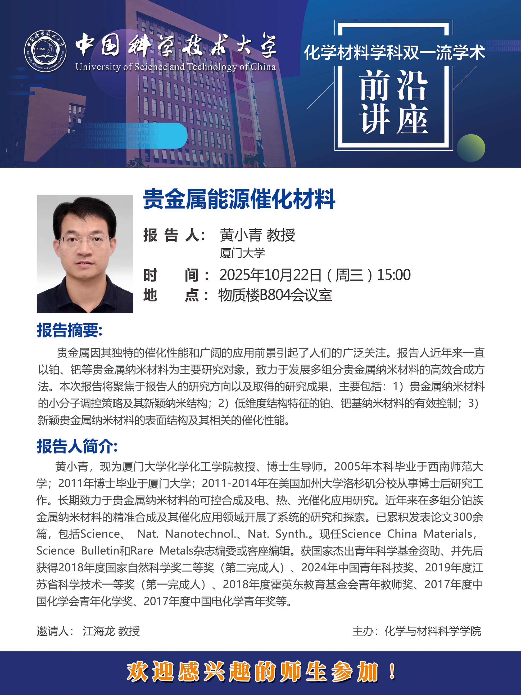 10月22日化学材料学科双一流学术前沿讲座——黄小青 教授(厦门大学)