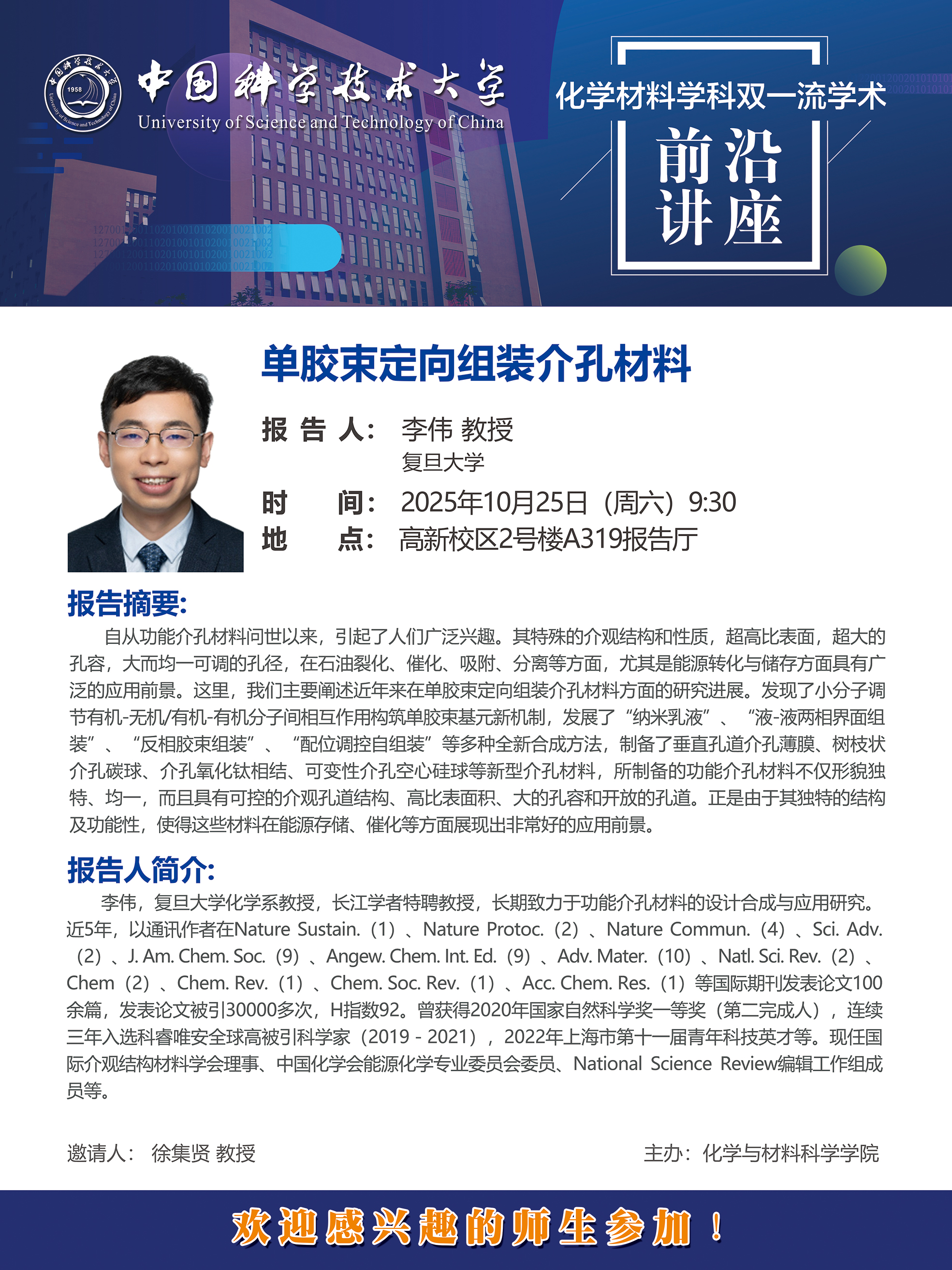 10月25日化学材料学科双一流学术前沿讲座——李伟 教授(复旦大学)