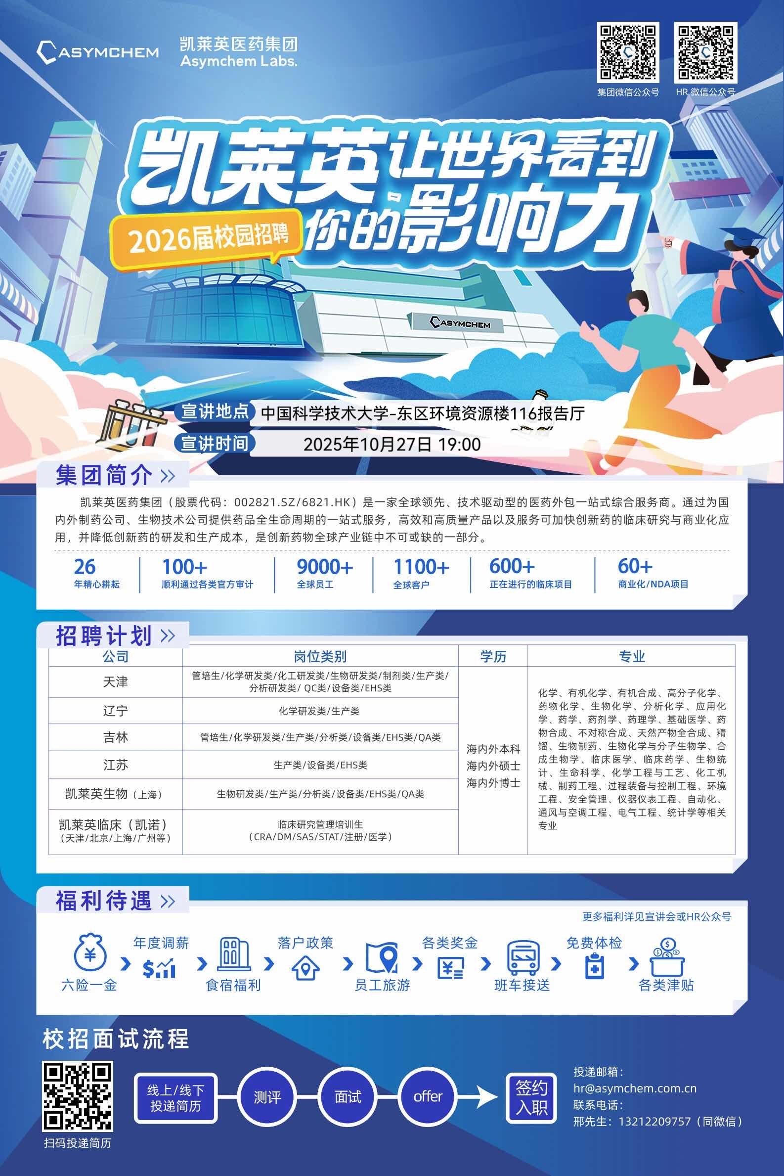 【10月27日下午7点】凯莱英医药集团中国科学技术大学招聘会