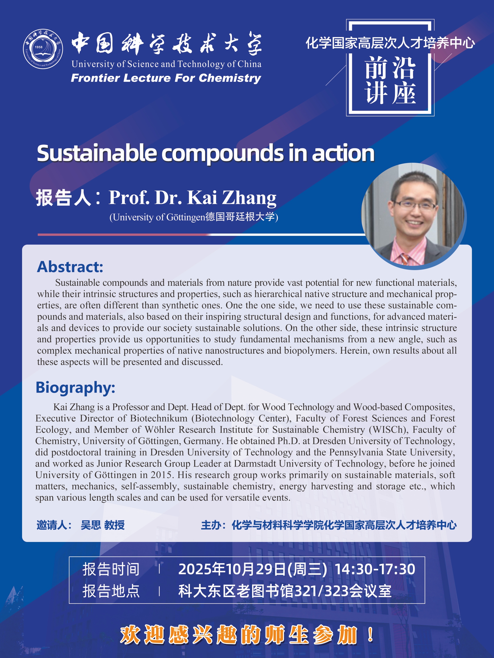 10月29日化学国家高层次人才培养中心前沿讲座——Prof. Kai Zhang(德国哥廷根大学)