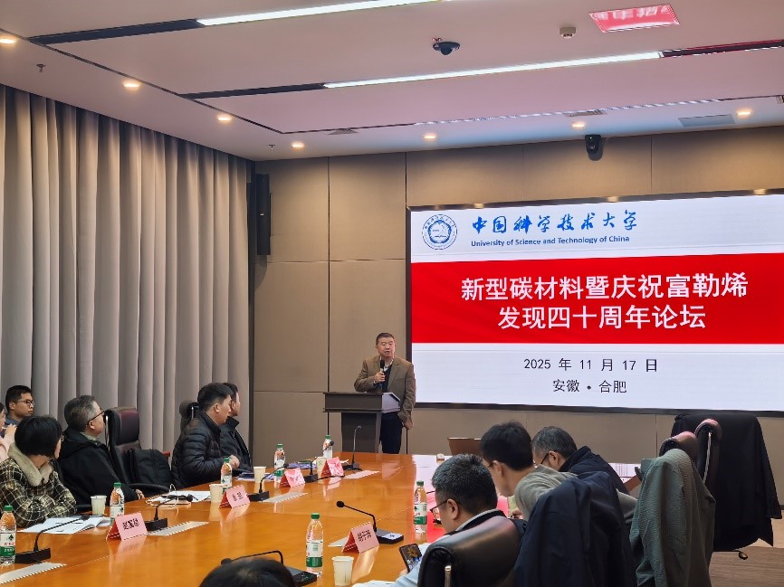 2025年11月17日,“新型碳材料暨庆祝富勒烯发现四十周年论坛”在中国科学技术大学成功召开。会议由中国科学技术大学化学与材料科学学院主办,化学与材料科学学院副院长杨上峰教授和材料科学与工程系张树辰教授共同主持,旨在促进碳材料领域的学术交流与合作,研讨碳材料领域未来的发展方向,并庆祝富勒烯发现四十周年。来自国内相关研究领域的专家、中国科学技术大学师生等50余人参加了会议。