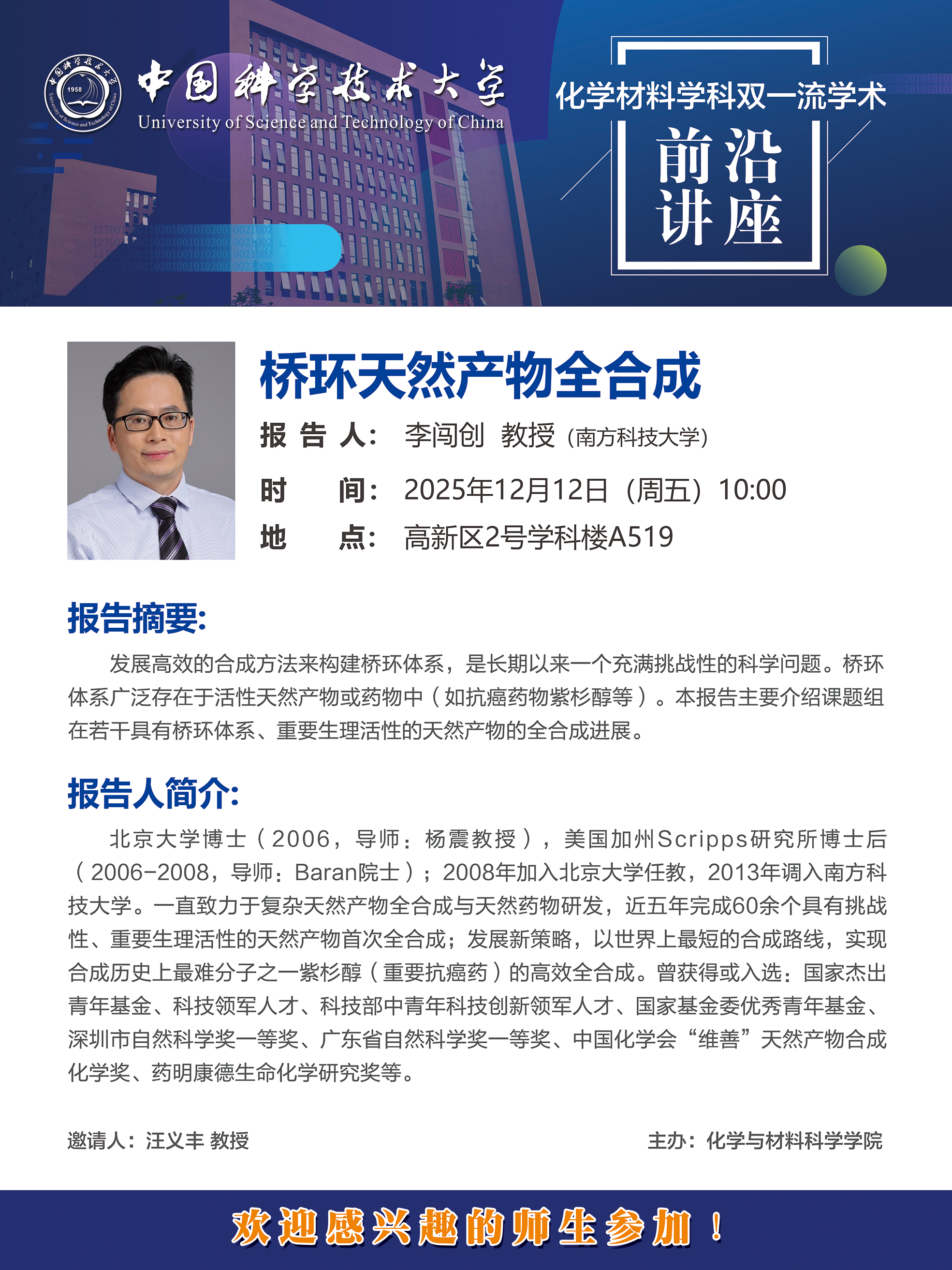 12月12日化学材料学科双一流学术前沿讲座——李闯创 教授(南方科技大学)