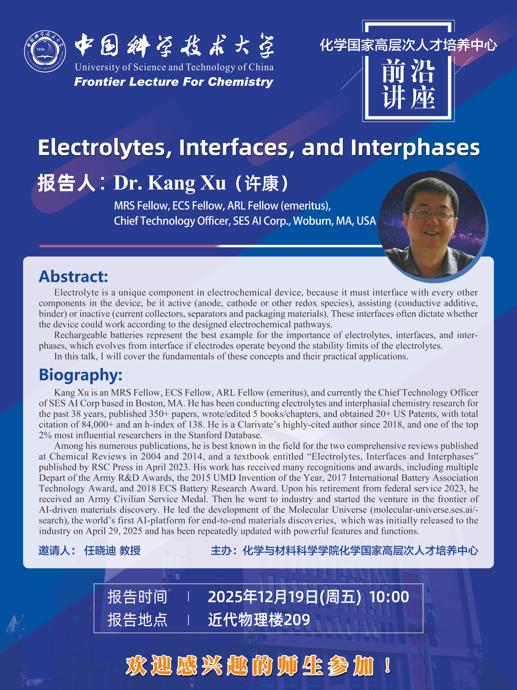 12月19日化学国家高层次人才培养中心前沿讲座——Dr. Kang Xu(MRS Fellow, ECS Fellow, ARL Fellow (emeritus), Chief Technology Officer, SES Al Corp., Woburn, MA, USA)