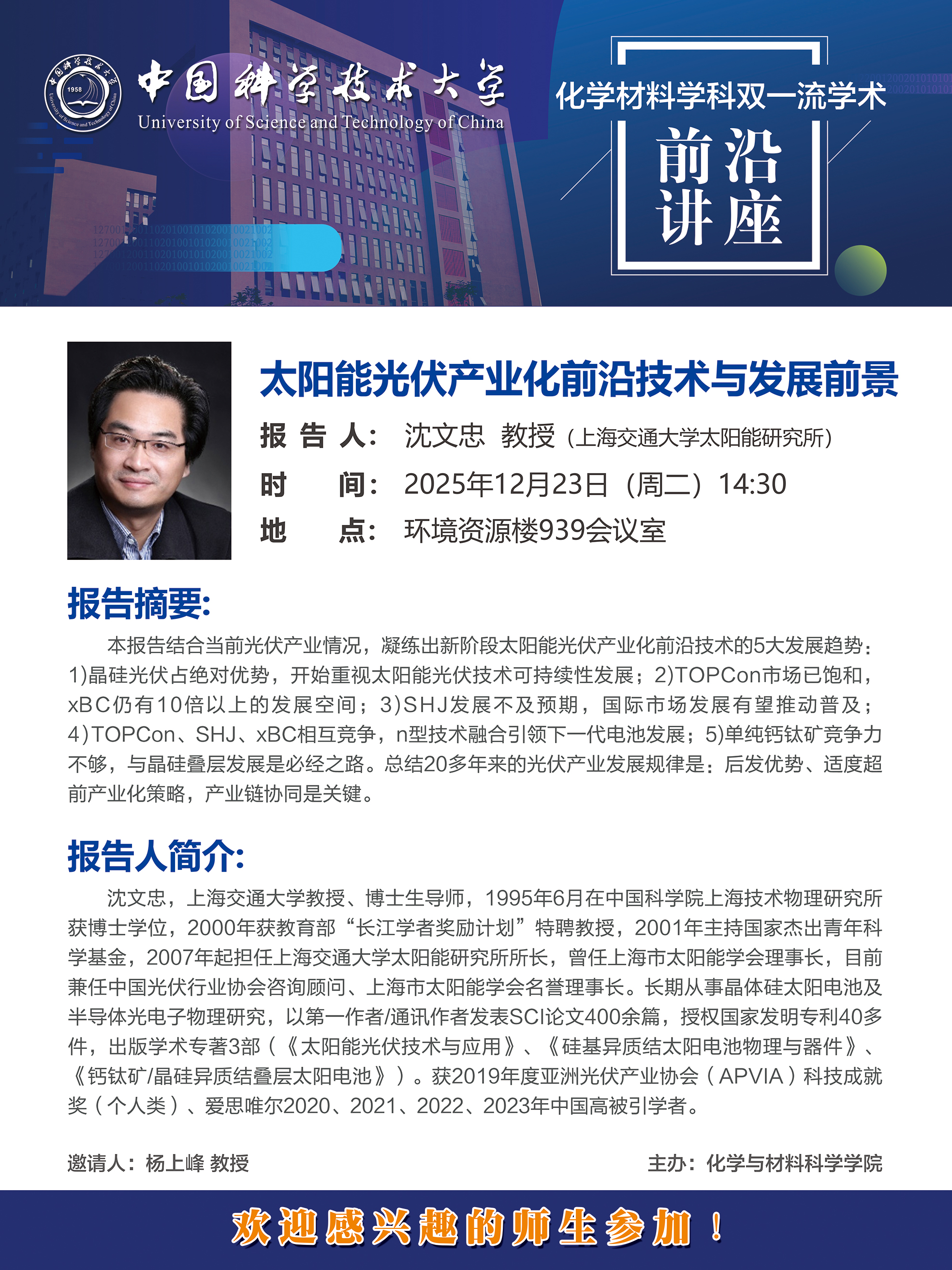 12月23日化学材料学科双一流学术前沿讲座——沈文忠 教授(上海交通大学太阳能研究所)