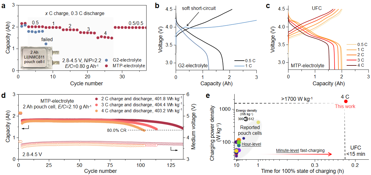在超低电解液用量的严苛工况下(0.80 g Ah⁻¹),使用MTP电解液的工业级2 Ah Li||NMC811软包电池实现了4 C(<15分钟充电100%)的超快充电,而未发生电池短路现象。此外,400 Wh kg⁻¹级的锂金属软包电池在4 C超快充放电条件下,仍能展现出>80%的可逆容量和>100次循环周期,充电功率密度高达1747.6 W kg-1,远超现有文献报道(图2)。