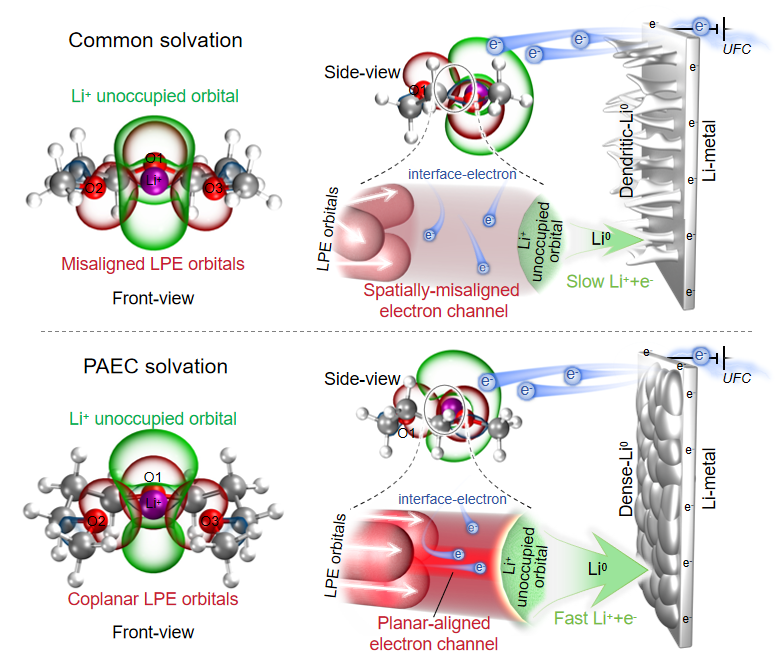 图1. 传统溶剂化的空间电子结构和新型的平面对齐电子通道示意图。