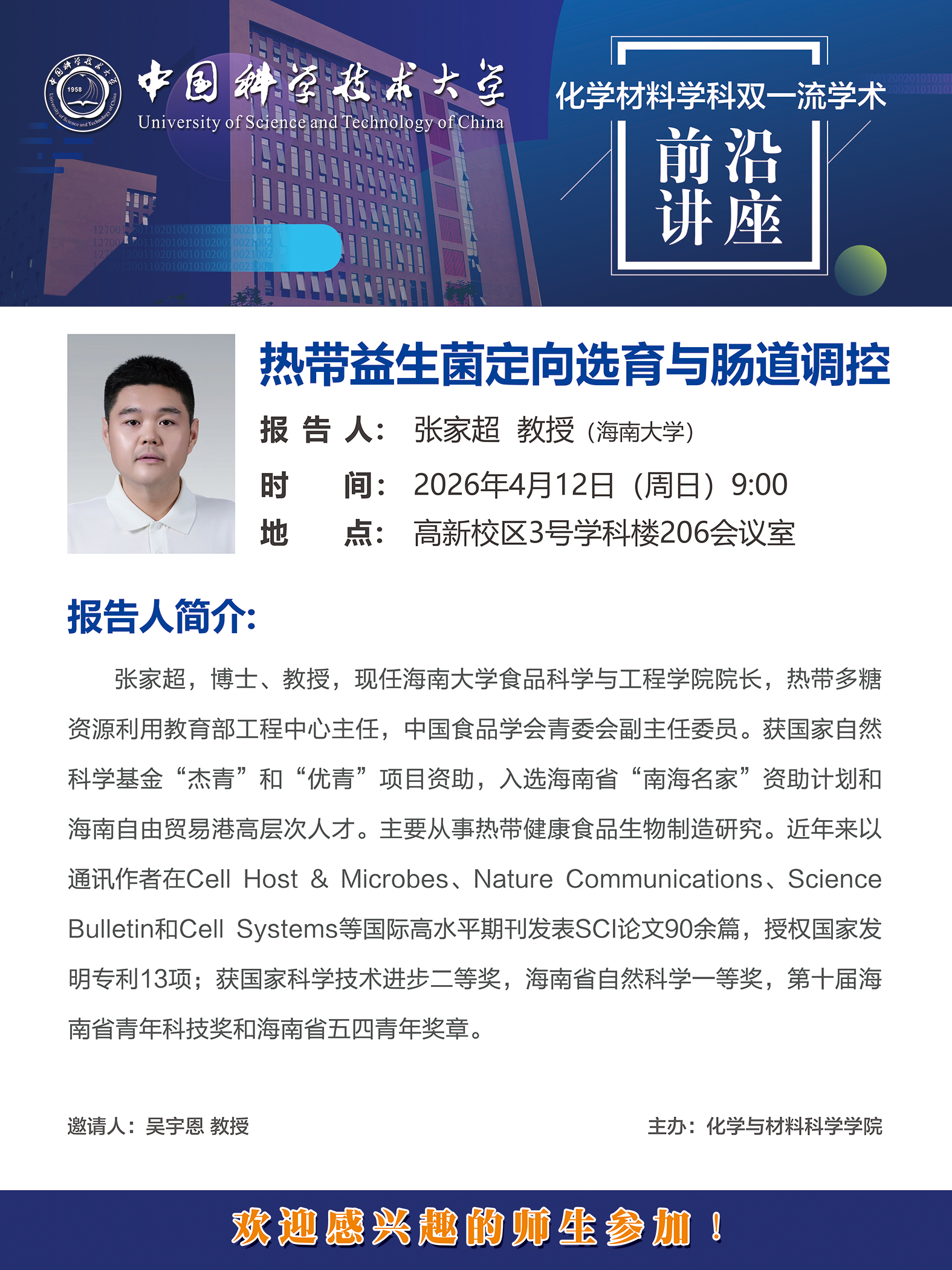 4月12日化学材料学科双一流学术前沿讲座——张家超 教授(海南大学)