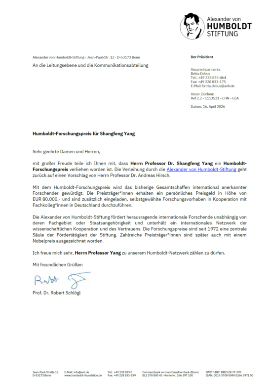 近日,我院杨上峰教授收到德国亚历山大·冯·洪堡基金会正式通知,荣获2026年度“洪堡研究奖”(Humboldt Research Award)。