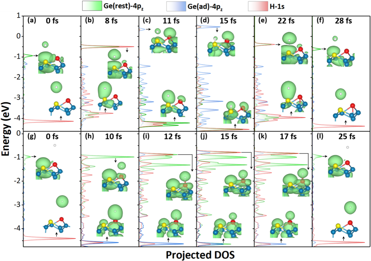 在此背景下,研究团队应用实时含时密度泛函理论(rt-TDDFT)与Ehrenfest动力学相结合的第一性原理方法,实现了对电子与原子核运动耦合过程的“实时”模拟。该方法能够在原子运动过程中同步描述电子结构演化,从而捕捉复杂的非绝热动力学行为。研究结果在氢原子平动能损失以及散射角分布等方面均与实验观测高度一致,成功再现了实验中发现的双峰能量损失特征。进一步分析表明,这一双峰结构来源于氢原子在重构表面不同Ge原子位点上的“位点选择性”碰撞行为:当氢原子与Ge表面的rest atom发生碰撞时,会形成瞬态Ge–H键,并触发超快的跨位点电子转移过程,从而产生显著的电子激发和较大的能量损失;而当氢原子与adatom相互作用时,尽管同样存在瞬态成键过程,但几乎不发生电子转移和电子激发,因此仅表现出较小的能量损失。这些结果表明,rt-TDDFT方法能够有效描述不同表面位点上化学键形成过程中显著不同的超快电子-核运动耦合动力学,为理解半导体表面非绝热能量传递机制提供了关键理论依据。