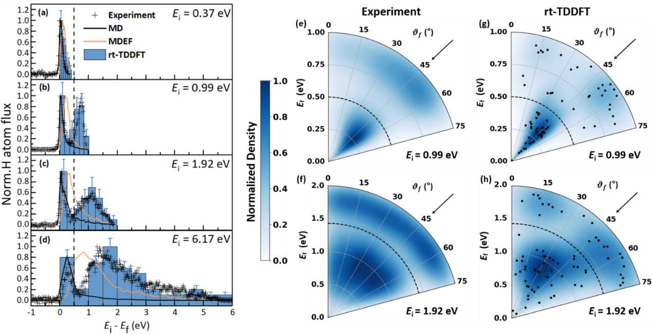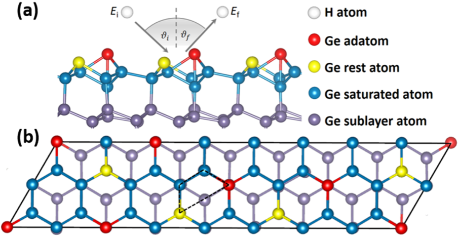 相比金属表面,半导体由于具有有限带隙,其电子激发与能量耗散机制更加复杂,使得相关问题更具挑战性。近年来,实验在Ge(111)-c(2×8)重构表面观测到氢原子散射过程中的显著非绝热效应:当入射能量超过表面带隙时,散射氢原子的能量损失呈现出明显的“双峰分布”,并表现出位点选择性特征。然而,传统基于Born-Oppenheimer近似的绝热动力学模拟以及基于电子摩擦理论的动力学模拟均无法对这一现象给出合理解释。