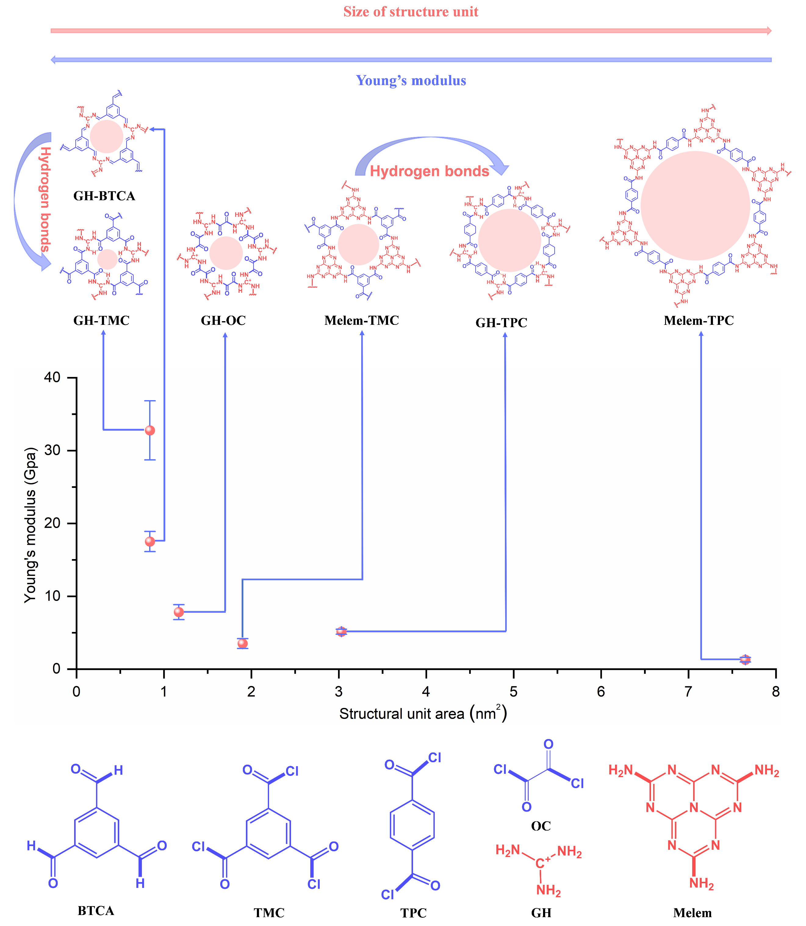 图1. 一系列二维聚酰胺薄膜结构单元及其相应的杨氏模量值。